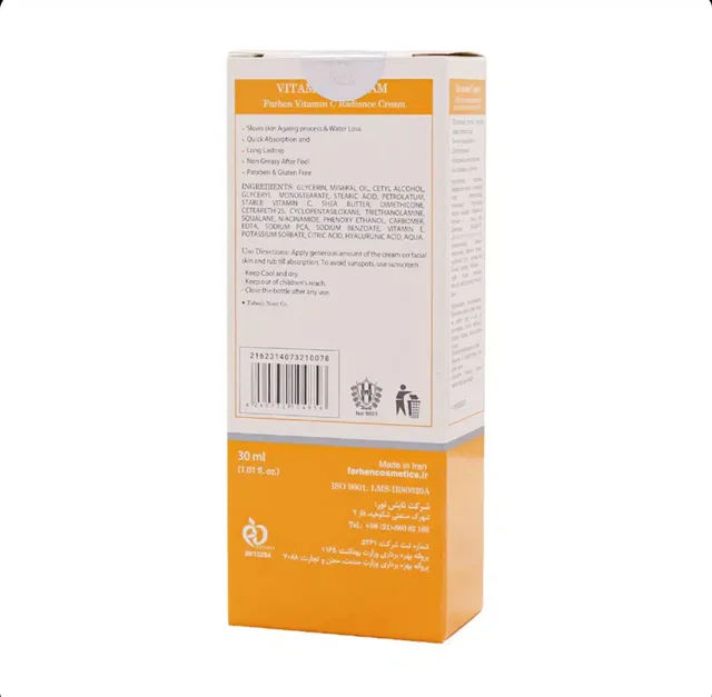 سایر توضیحات کرم روشن کننده ویتامین سی فاربن موجب افزایش کلاژن سازی و جوان سازی پوست شده و از ایجاد لکههای تیره، پیری پوست و چروک صورت جلوگیری مینماید و یک ضد لک و روشن کننده قوی می باشد. این ژل برای افرادی که دارای کک و مک هستند بسیار مناسب است و به دلیل دارا بودن ویتامین Cپایدار و ویتامین B3 از پیری زودرس پوست جلوگیری میکند. استفاده مداوم از ژل کرم ویتامین سی فاربن، موجب رطوبت رسانی به پوست میشود. عصارههای گیاهی و آنتیاکسیدان های موجود در این محصول با خنثیسازی رادیکالهای آزاد و رطوبت رسانی موثر برای پوست ظاهری سالم، شاداب و جوان به ارمغان میآورد. ویتامین C در ترکیب خود، با خستگی، استرس و پیری پوست مقابله نموده و خاصیت کلاژن سازی دارد. همچنین رطوبت، شادابی و شفافیت را به پوستهای کدر بر میگرداند. این محصول بدون آن که اثری از چربی روی پوست بهجا بگذارد، بهسرعت جذب پوست میشود. با مصرف این محصول روزبهروز به شفافیت، شادابی و صافی پوست افزوده خواهد شد. کرم روشن کننده ویتامین سی فاربن فاقد پارابن و گلوتن است